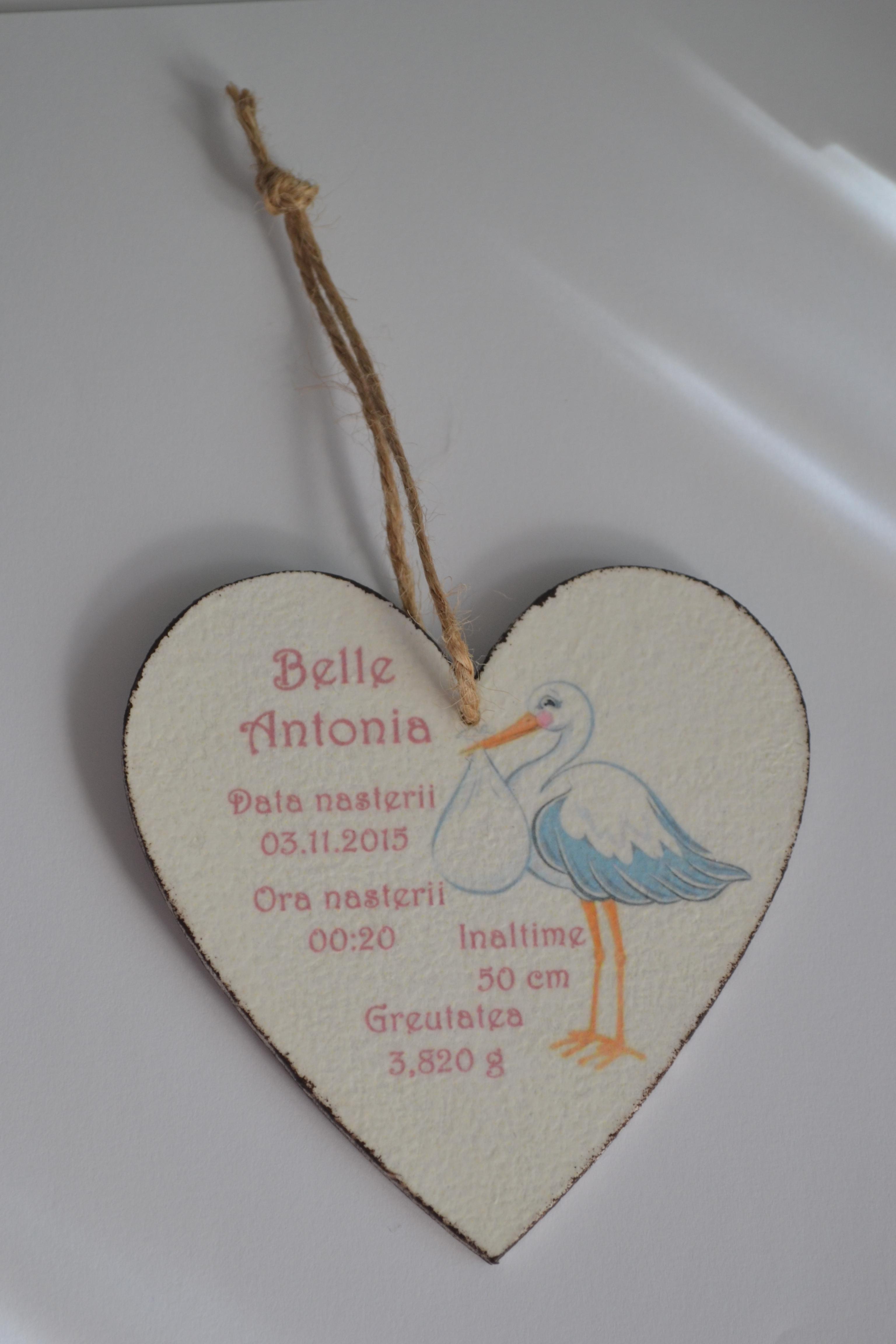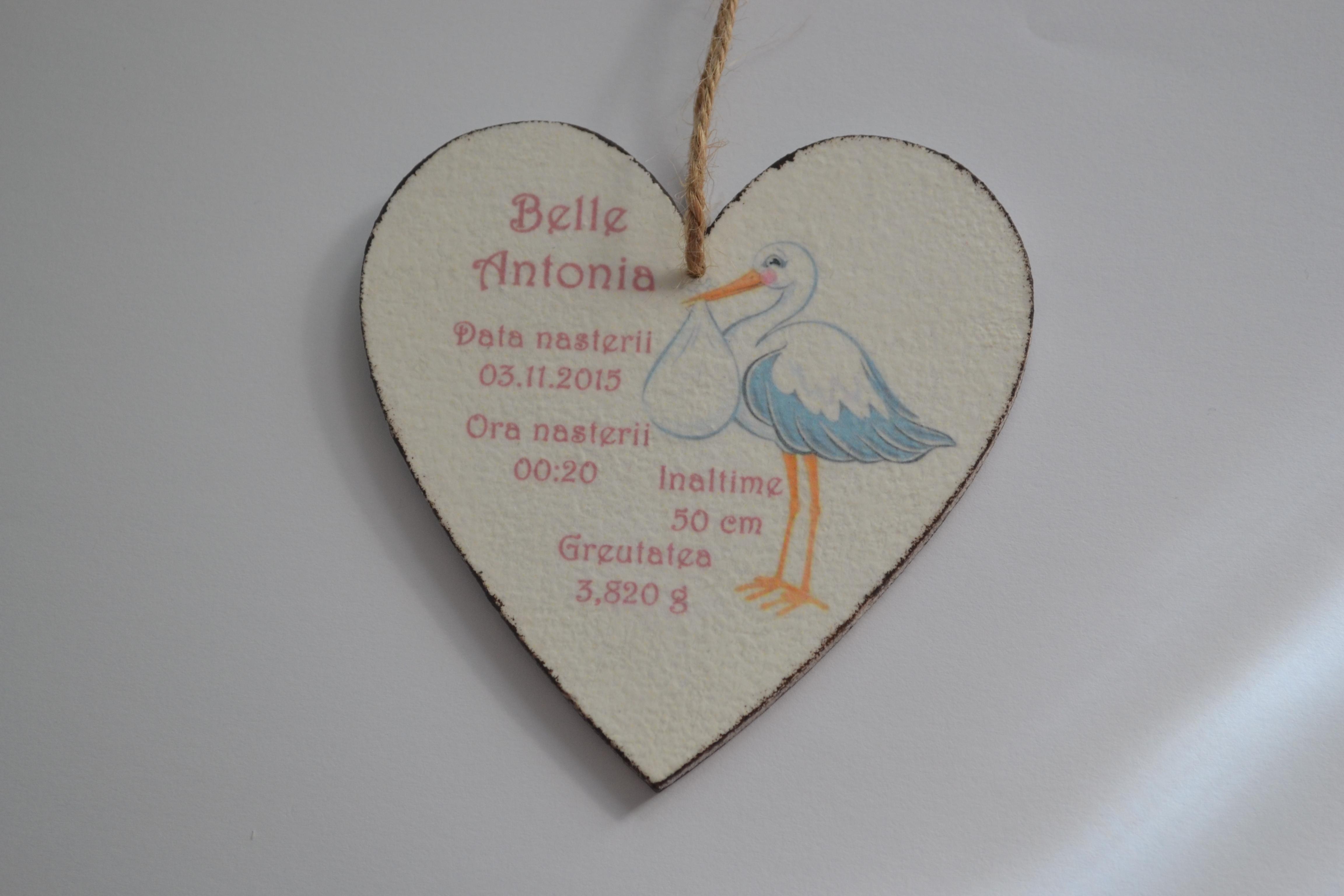 Inimioara se poate personaliza cu numele bebelusului, data nasterii, ora nasterii, inaltime si greutate.
