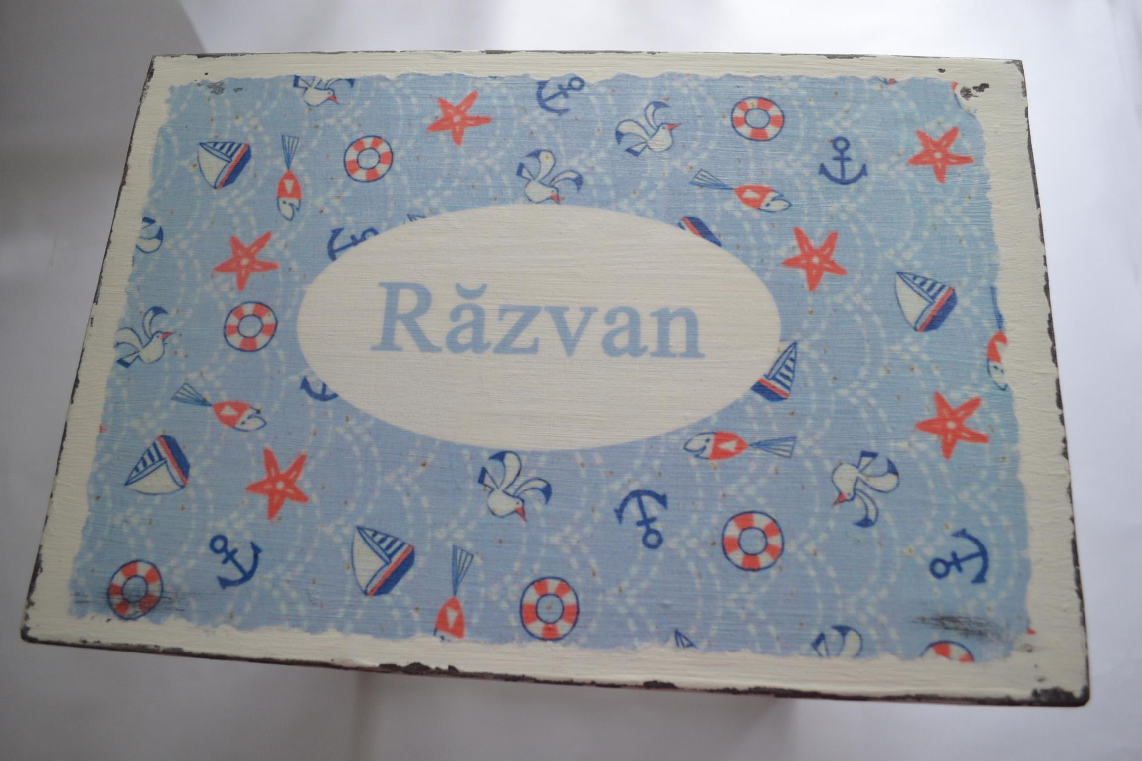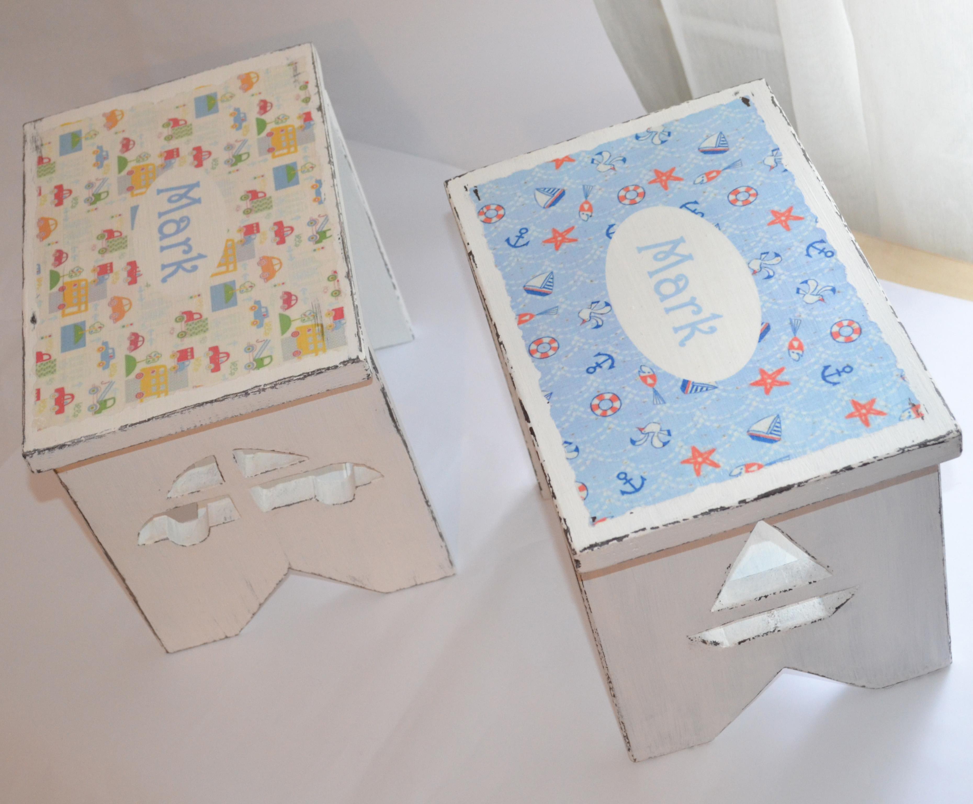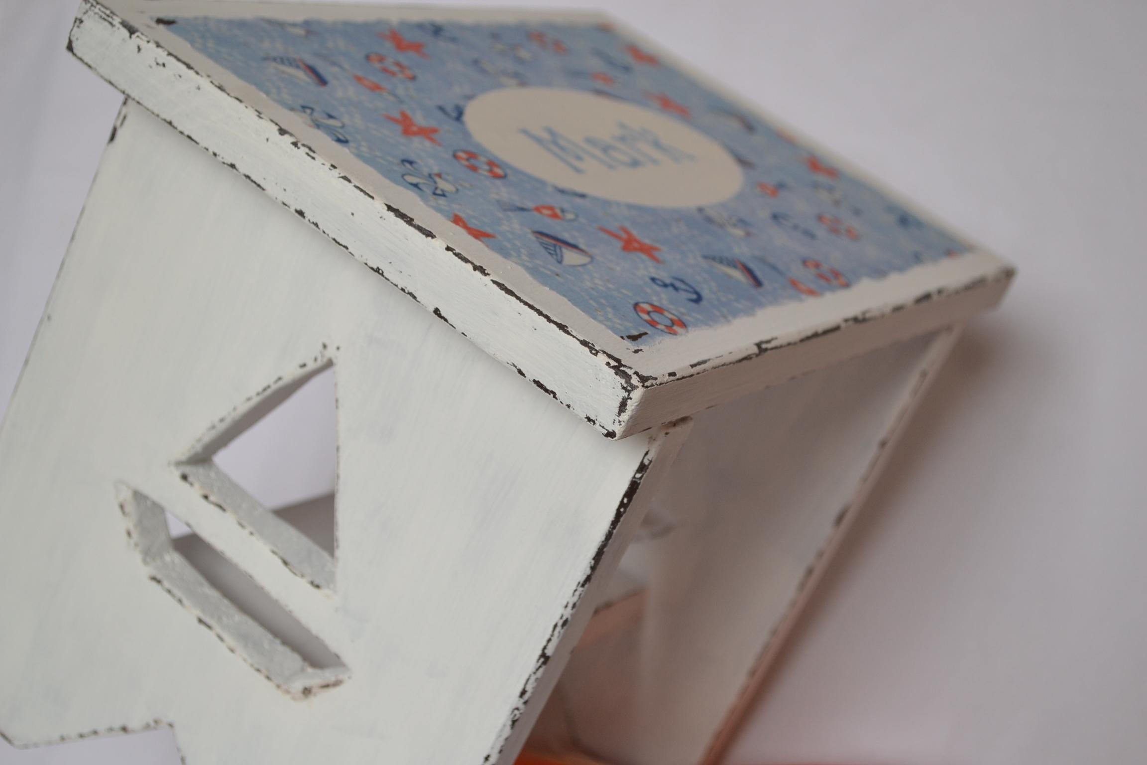 Scaunelul este din lemn, realizat manual, iar decorarea s-a realizat cu vopsele acrilice si tehnica decoupage. Produsul este antichizat si lacuit pentru a proteja culoarea si pentru a oferi o rezistenta sporita in timp.